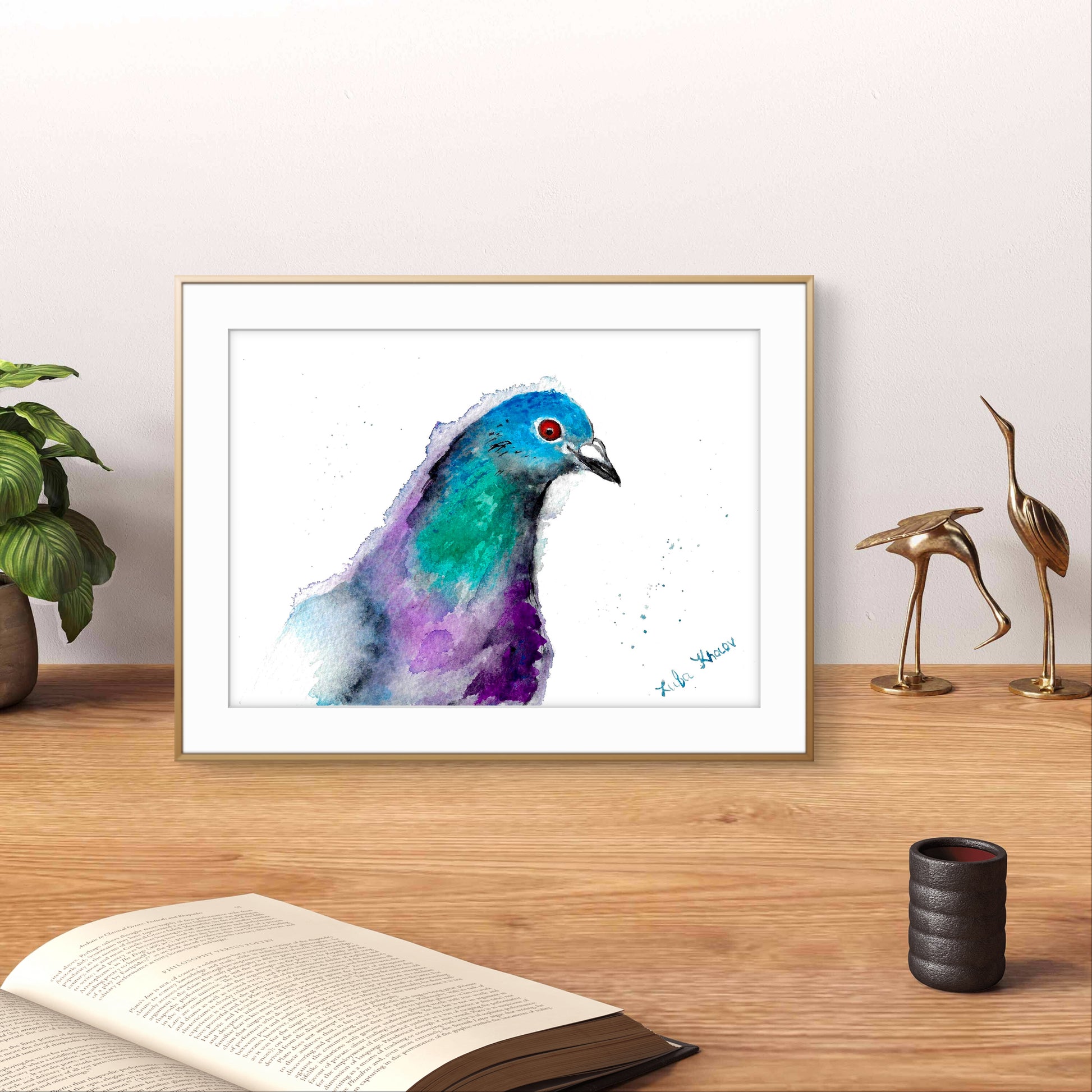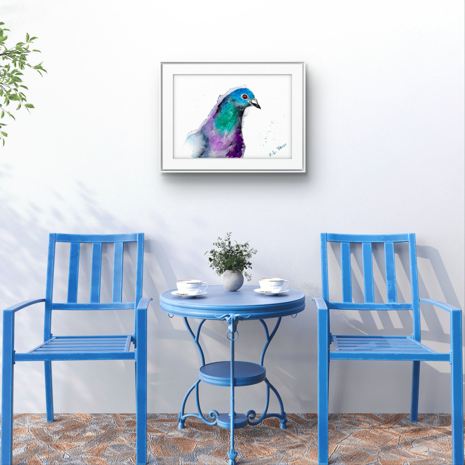 Painted in bold yet tender tones of violet, teal, and indigo, this New York City pigeon turns its head with a gaze that feels deeply human—reflecting the familiar ache of yearning for a loved one who is away. Its vivid red eye holds emotion, curiosity, and hope, standing out like a heart exposed.