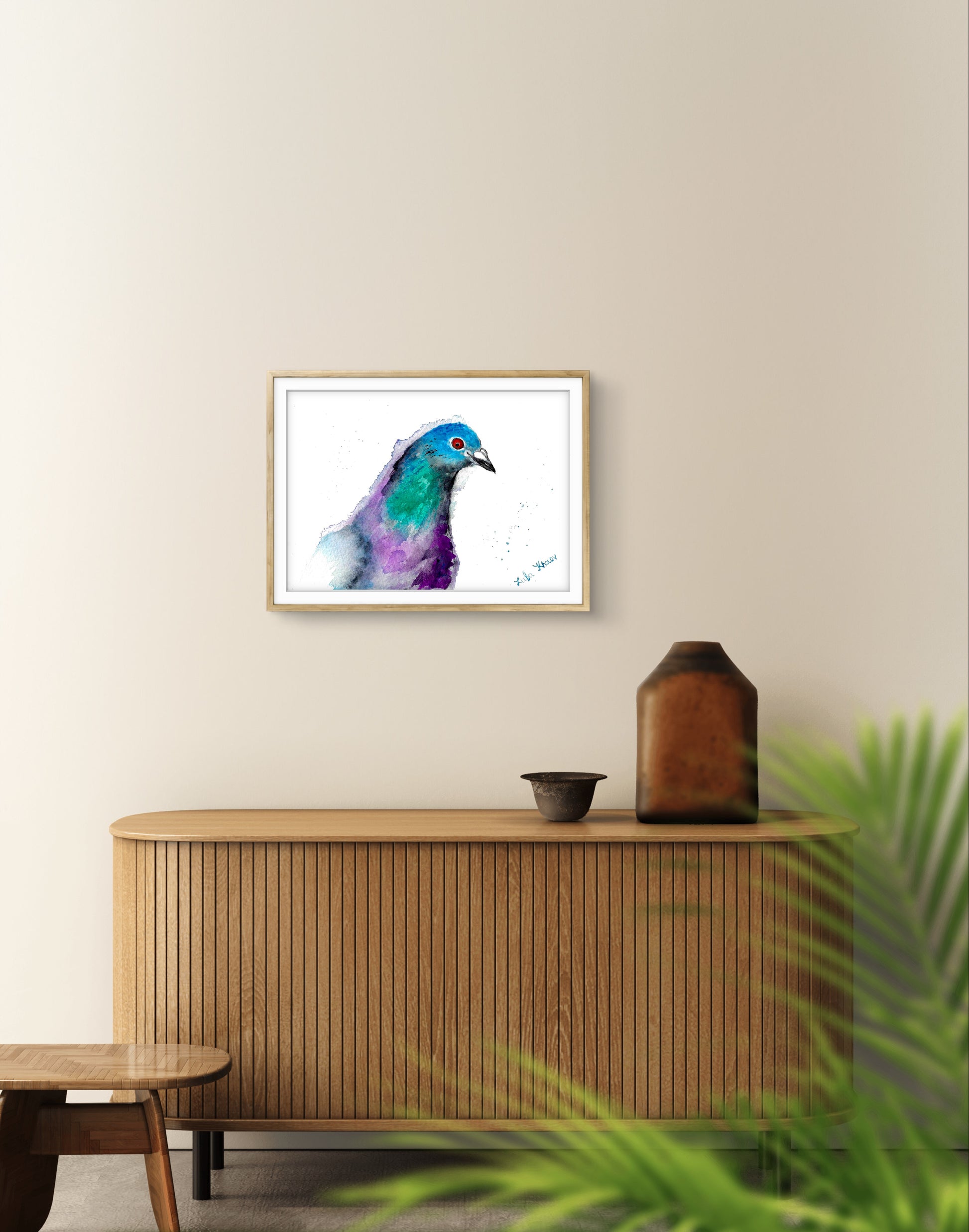 Pigeon-In-Waiting Art Print is reproduced from an original watercolor painting by Luba Kholov and is part of the Birds of NYC series.